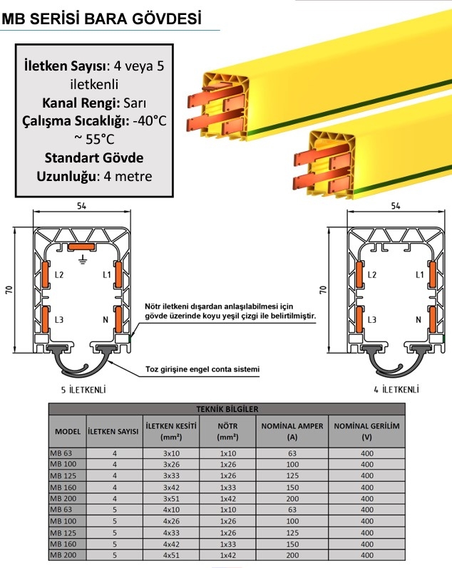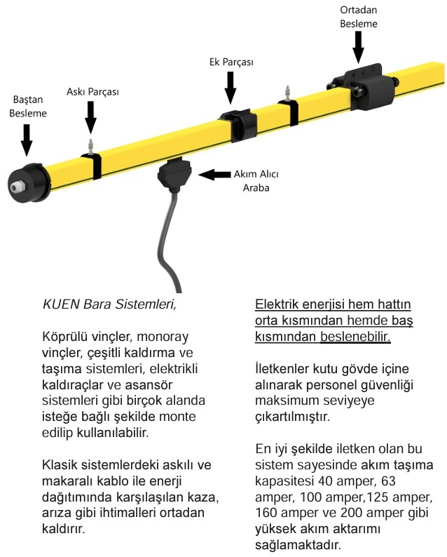 Busbar systems can be mounted and used upon request in various fields such as bridge cranes, monorail cranes, different lifting and transport systems, electric hoists, and elevator systems. They eliminate negligence such as accidents and failures encountered in energy distribution with suspended and pulley cables in classical systems. Electrical energy can be supplied from both the middle and the end of the line. Conductors are enclosed in a box body, ensuring maximum personnel safety. Thanks to this system with excellent conductive properties, it allows high current transfer capacities of 40 amperes, 63 amperes, 100 amperes, 125 amperes, 160 amperes, and 200 amperes.