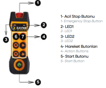 • As the INT, Power, Stop, and Data LEDs (2) on the receiver light up in sequence, hold down the hook buttons (6 and 7) on the transmitter.